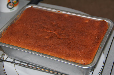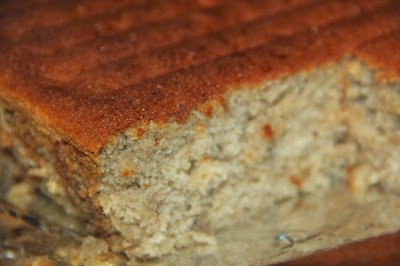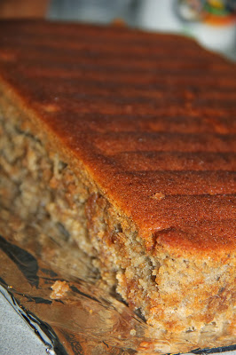 I bake this cake at 160c in the beginning follow the recipe for 45mins but turn out the cake still under cook, and so i bake another 30mins 160c, placed cake on lower rack oven not center. so a total of 1 hour 15 minutes. When the baking time was over, i was so excited and removed the cake from oven, the burn on top was not really as brown, when i insert a skewer to check came out clean. When i tried to remove from the baking pan, gently run around with the knife, i find that the cake still sticky..Rggggrrr....( a little lost patience...), so i dump in the oven again bake for another 10mins and increase the oven temperature to 200c. Maybe we just need to know our OVEN well!! My oven is not a high tech or expensive one, so i think that is why i always get problem with baking time and temperature. a lousy oven!! and.........hold my breath, patiently waiting for the cake to be cooked, Well after another 10mins 200c, the banana cake was cooked Perfectly!! The banana cake SMELLs awesome!!!!! i removed the cake from pan and on wire rack to cool.