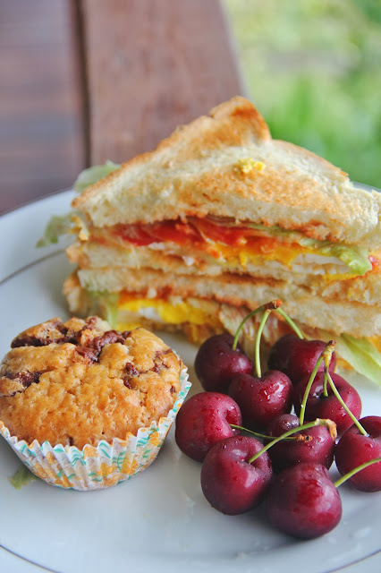29.12.2013 - Nongsa, Batam. Love today breakfast! My sandwich simply easy to prepare, 2 slices of toasted bread, topside egg, 1 slice of cheddar cheese, a slice of lettuce and 4 slices of tomato with a dash of tomato sauce and mayo, cut the sandwich into half served. I got my chocolate muffin too and some fresh cherries!! what a bliss!!