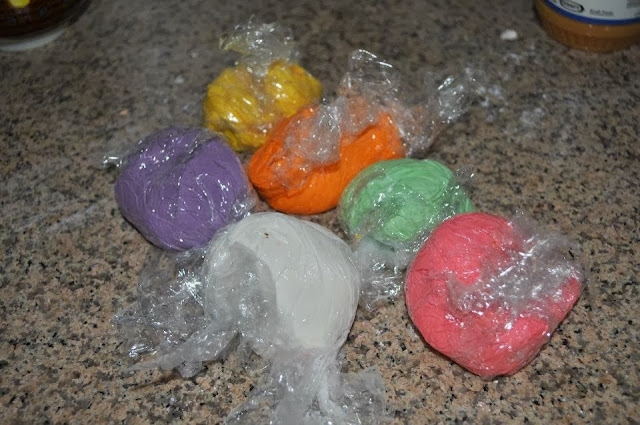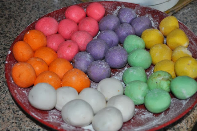 2. Divide the dough into four, one plain, one with pandan paste, one with strawberry paste and one with orange food colouring. Set aside.
