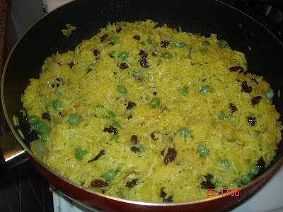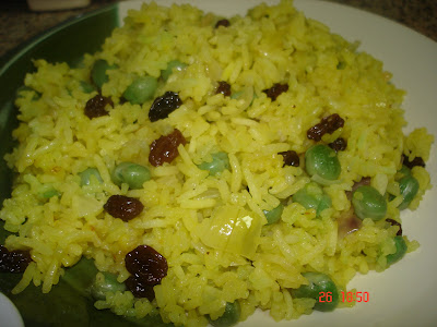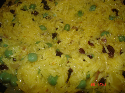 * bring back to gentle boil, stir again and let the rice simmer, uncoverred for about 10 minutes, until all water has been absorbed. reduce heat, add in raisins and frozen peas recover lid and leave to stand for 15 minutes, till cooked keep checking.